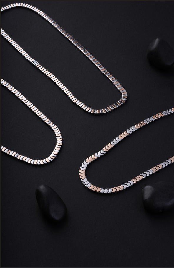 Unlock timeless style and spiritual charm with the Men's Designer Dual-Tone Lucky Bracelet Set from Pavitra Aura. This stunning duo features two handcrafted sterling silver bracelets — one designed with a honeycomb texture for a bold statement, and the other with a sleek, bar-link pattern for refined minimalism. The combination of oxidized black and rose-gold polish offers a versatile aesthetic that complements any outfit, from ethnic kurtas to crisp formalwear.