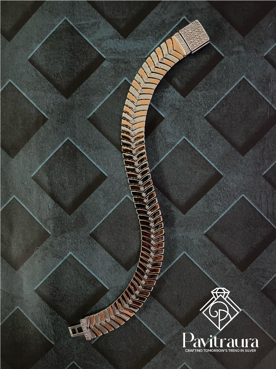 Unlock timeless style and spiritual charm with the Men's Designer Dual-Tone Lucky Bracelet Set from Pavitra Aura. This stunning duo features two handcrafted sterling silver bracelets — one designed with a honeycomb texture for a bold statement, and the other with a sleek, bar-link pattern for refined minimalism. The combination of oxidized black and rose-gold polish offers a versatile aesthetic that complements any outfit, from ethnic kurtas to crisp formalwear.